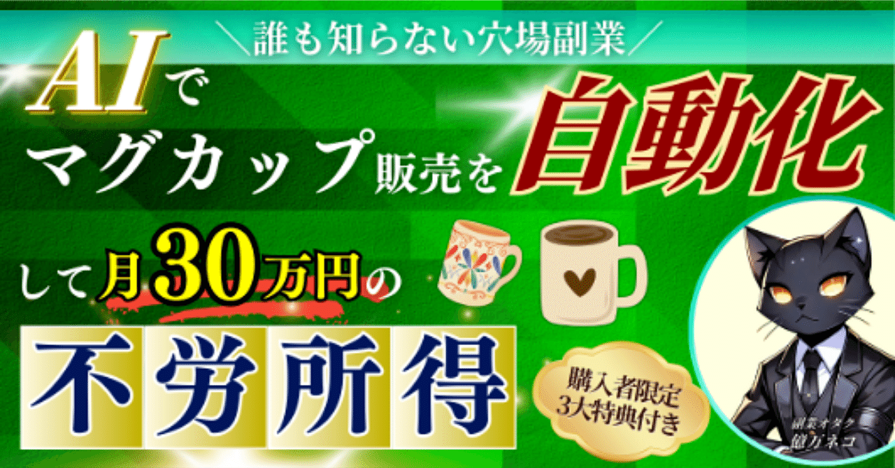AIを活用してマグカップ販売を完全自動化し、月30万円の不労所得を実現する方法を体系的に解説した記事です。