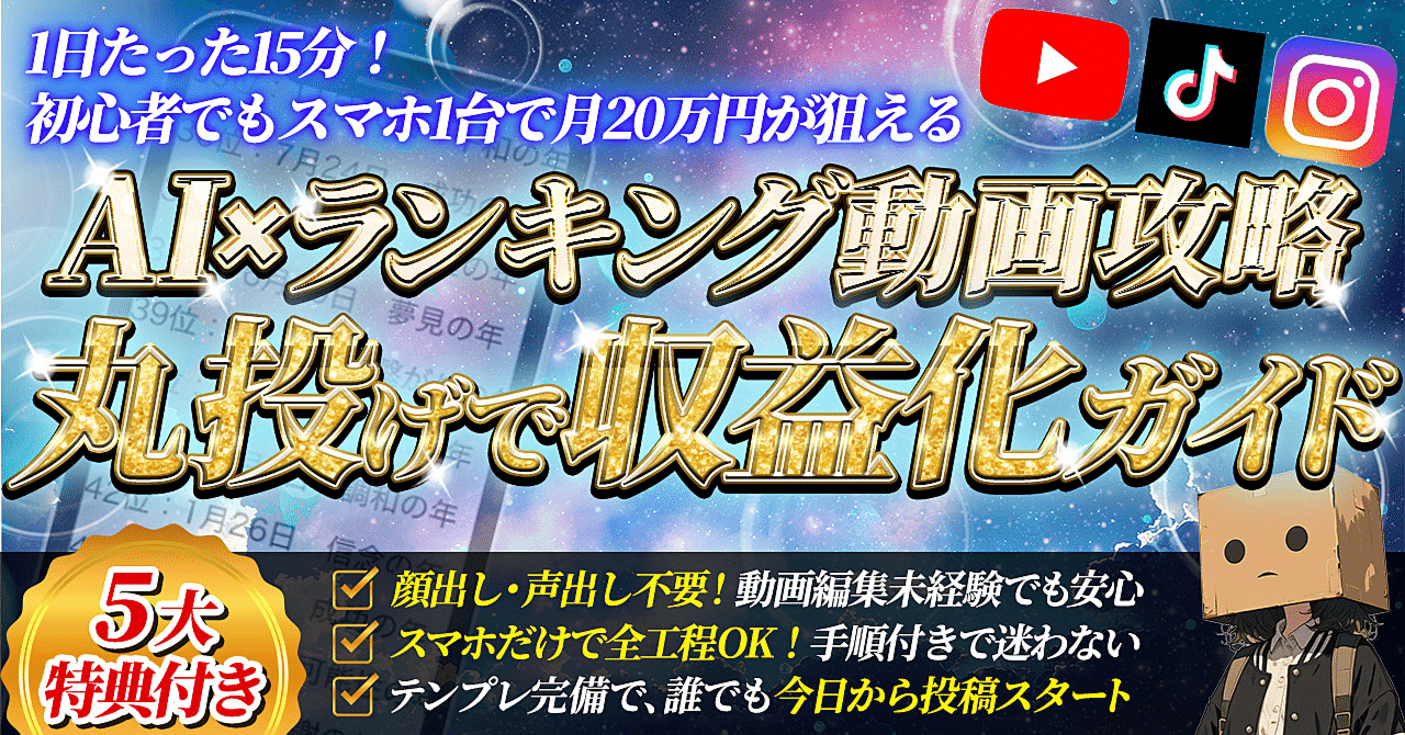 このマニュアルは「副業に興味はあるけれどスキルがない」と悩む人に最適です。AIを味方につけることで、ランキング動画というシンプルかつ収益性の高いジャンルに挑戦でき、短期間で副収入の第一歩を踏み出せます。