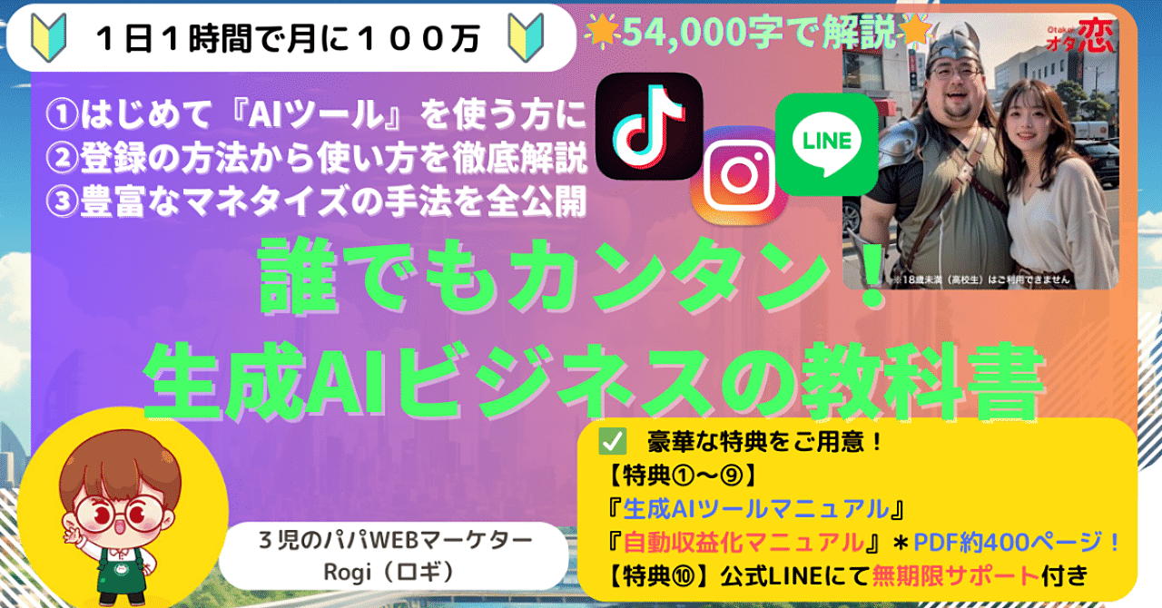 このマニュアルは「AIを使いたいけど稼ぎ方がわからない」「副業で結果を出せない」と悩む人に最適です。生成AIを活用した効率化と自動化で、誰でも短期間で収益化を実現できる実践的なロードマップが手に入ります。