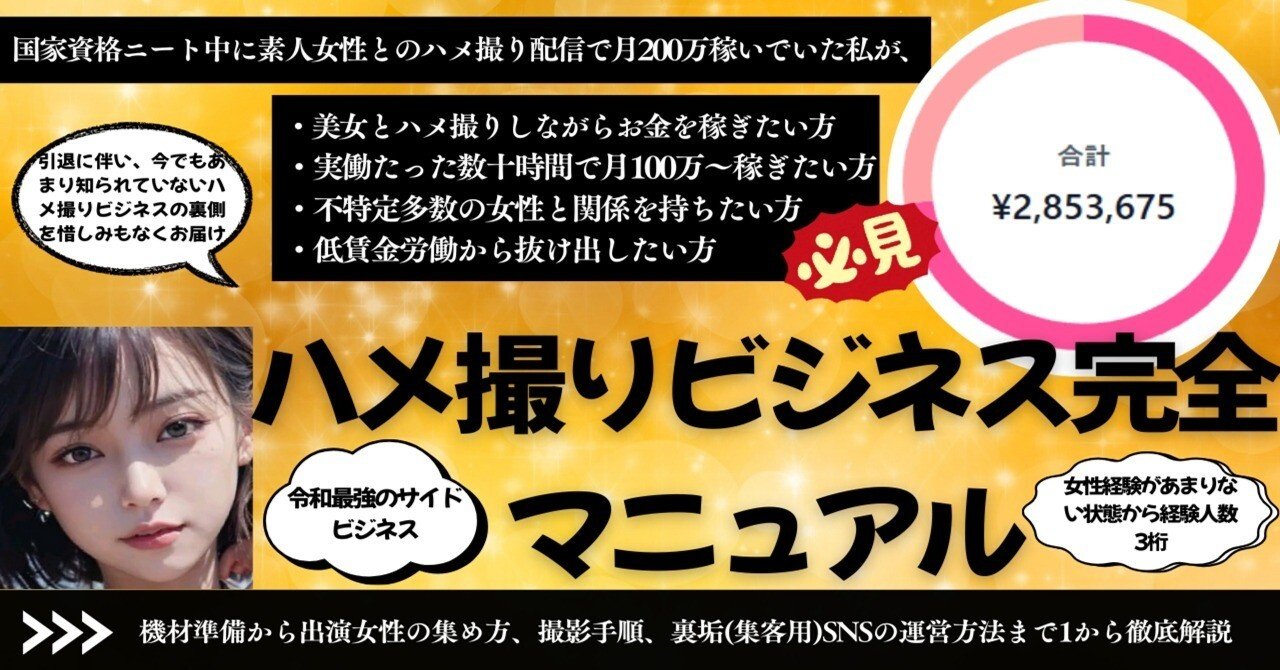 ハメ撮りビジネスというニッチな分野で、未経験から月収200万円を達成した筆者が、実体験をもとに収益化の全工程を解説。撮影・編集・販売までを個人で完結させる方法や、SNSを活用した集客導線、プラットフォーム選びのコツまで網羅。