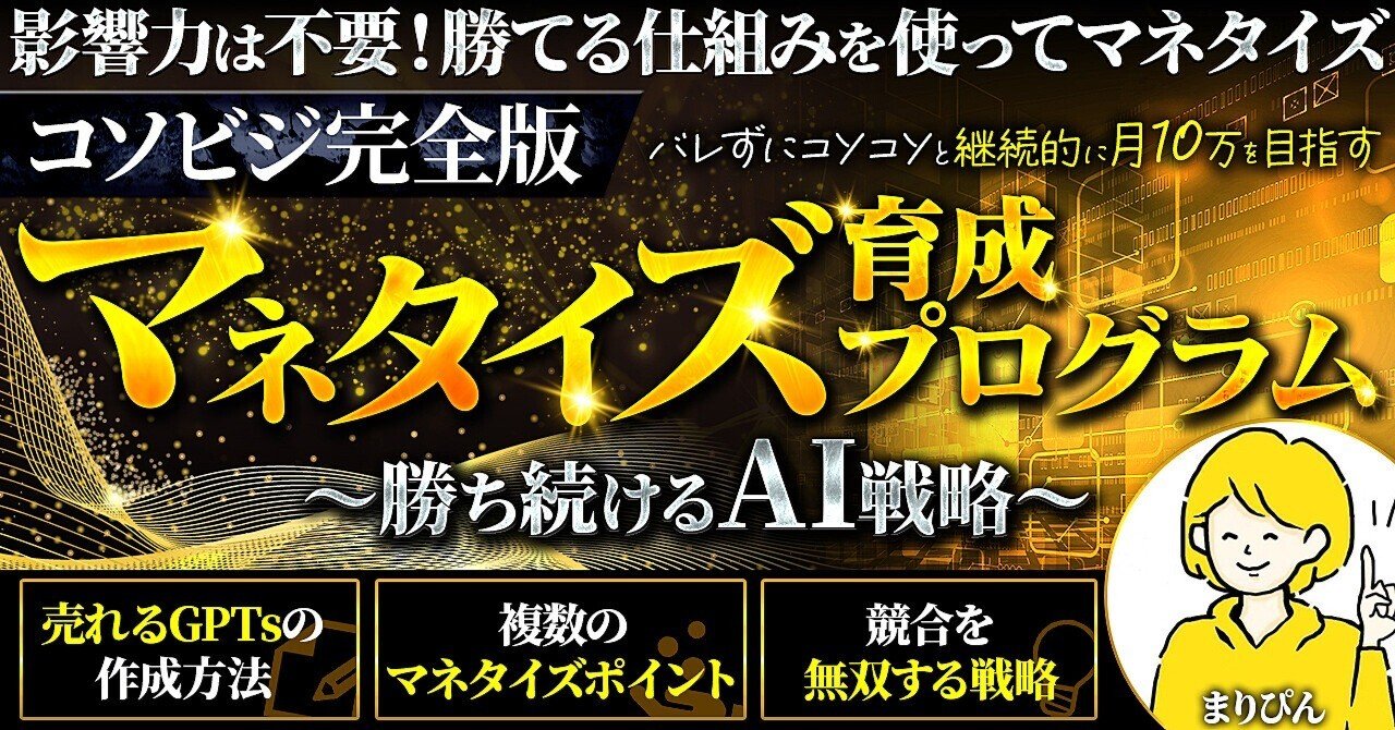 「コソビジ完全版 マネタイズ育成プログラム ~勝ち続けるAI戦略~」は、AIを活用した副業・小規模ビジネス(コソビジ)で持続的に収益をあげ続けたい人向けの育成プログラムです。