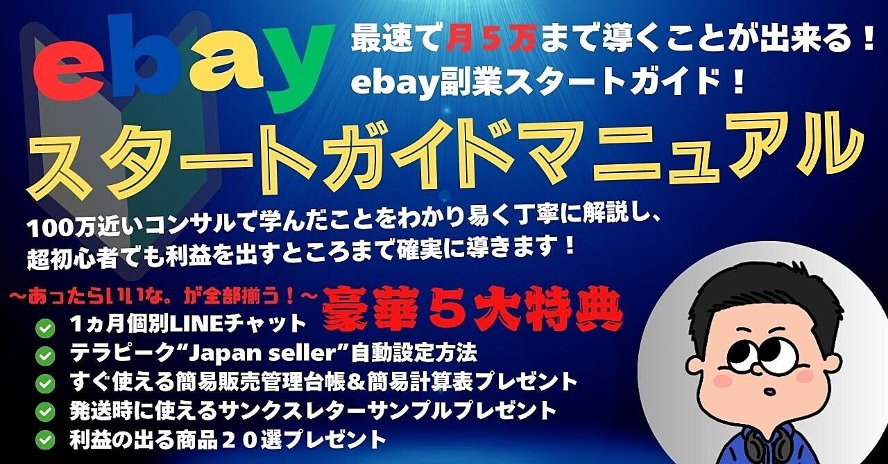 eBay輸出を始めたい初心者向けに、最短で月5万円の副収入を目指せるスタートマニュアルです。
