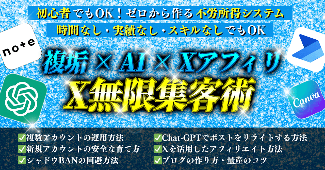 「X自動投稿×Chat-GPT×無料ブログで作る『Xアフィリ自動化システム』」は、アフィリエイト初心者が手間とコストをできるだけ抑えて、継続可能な収益の仕組みを作るための実践的な教材です。