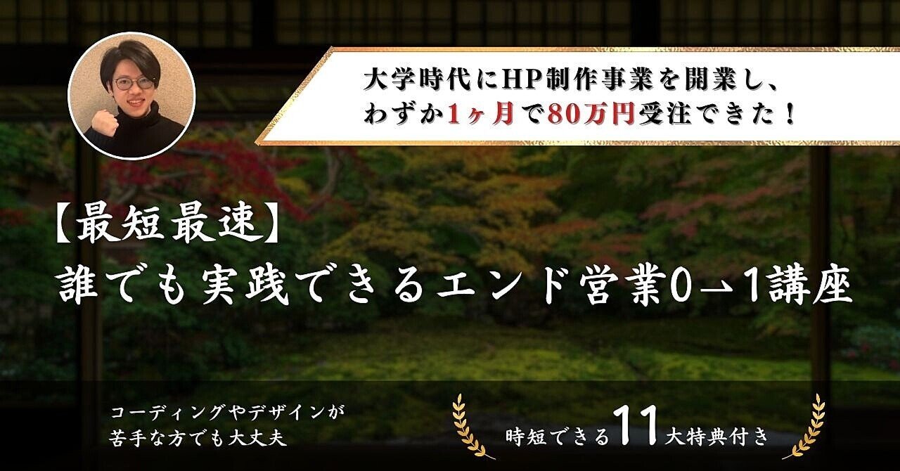 エンド営業に挑戦したいけれど「コーディングが苦手」「デザインができない」「毎日投稿できない」と悩む人でも、最短で0→1達成できる方法を体系的に学べる講座です。