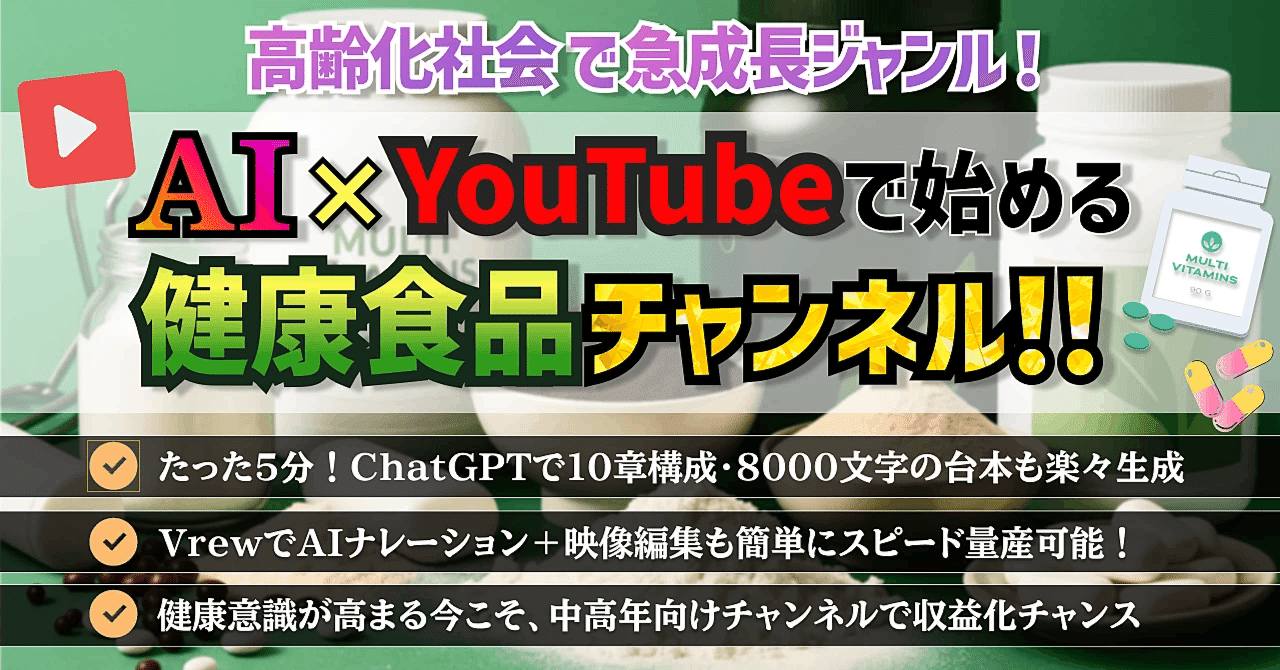 高齢化が進む日本社会で、安定的に伸びるジャンルとして注目される「健康食品」をテーマに、AIを使って動画を量産し、YouTubeで収益化する方法が紹介されています。