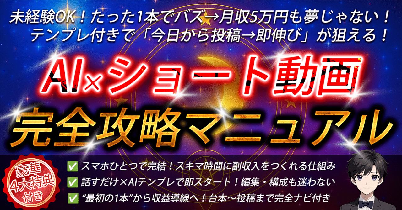 このマニュアルは「副業をしたいけど時間やスキルがない」と悩んでいる人に最適です。AIを活用することでショート動画の制作・運用が簡単になり、収益化までの流れをスムーズに習得できます。