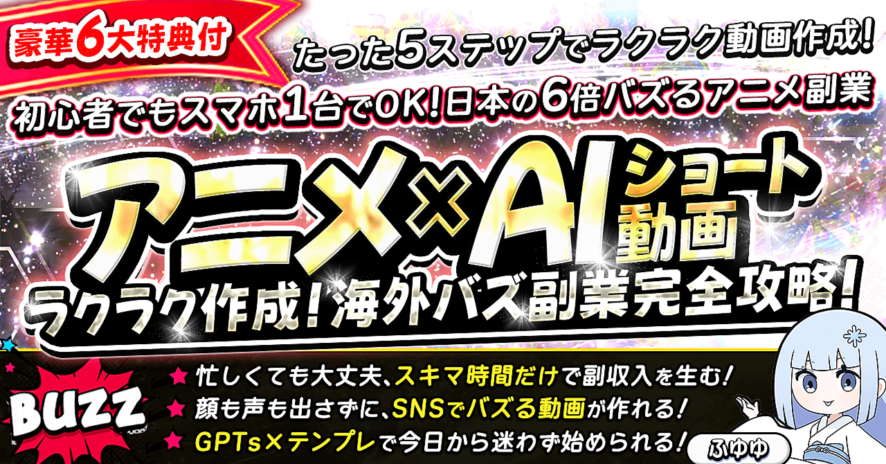 アニメーションとAIを組み合わせたショート動画制作で、顔出し・声出し不要、スマホでも完結する副業モデルが学べます。