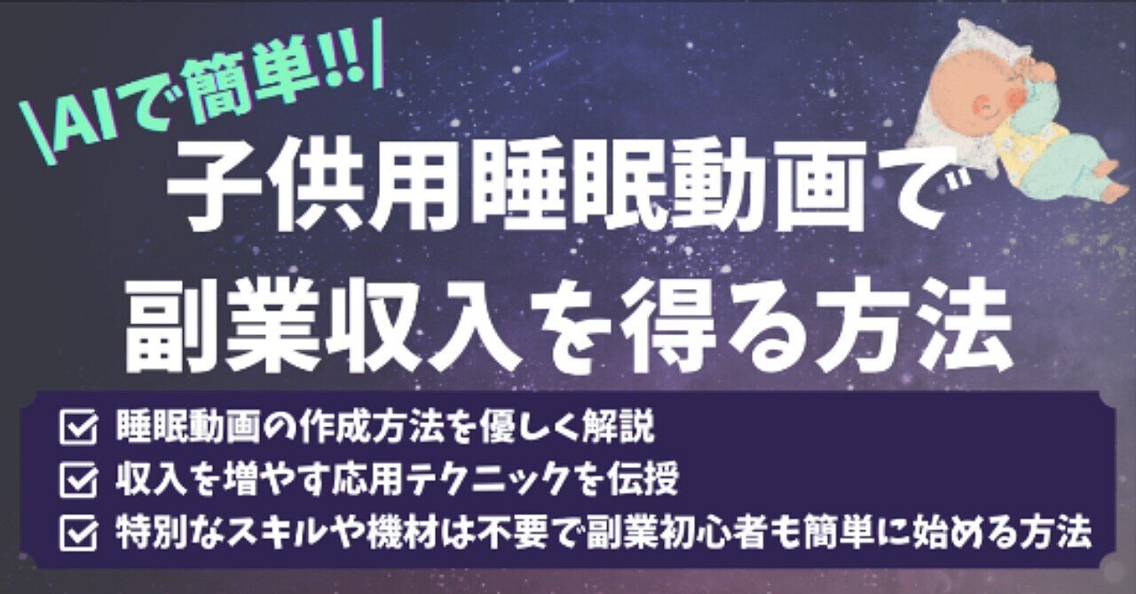 子供の寝かしつけを助ける「睡眠動画」をAIで効率的に制作し、副業として収益化する方法が解説されています。動画編集や高度なスキルがなくても取り組める点が魅力で、誰でも短期間でチャレンジできる仕組みが整っています。