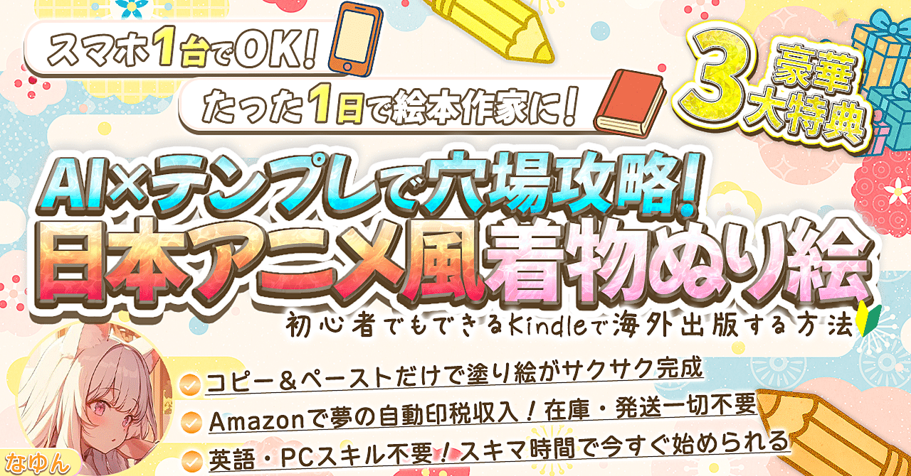 AIとスマホだけで、アニメ風の着物塗り絵を簡単に作れるノウハウが詰まった一冊です。専門的な知識や高度なスキルは必要なく、スマホ1台あればすぐに取り組めるのが最大の魅力。