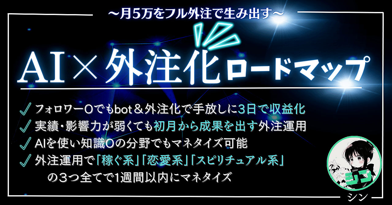 AIを活用しながら外注化を組み合わせ、安定的に月5万円の収益を作り出すロードマップが解説されています。