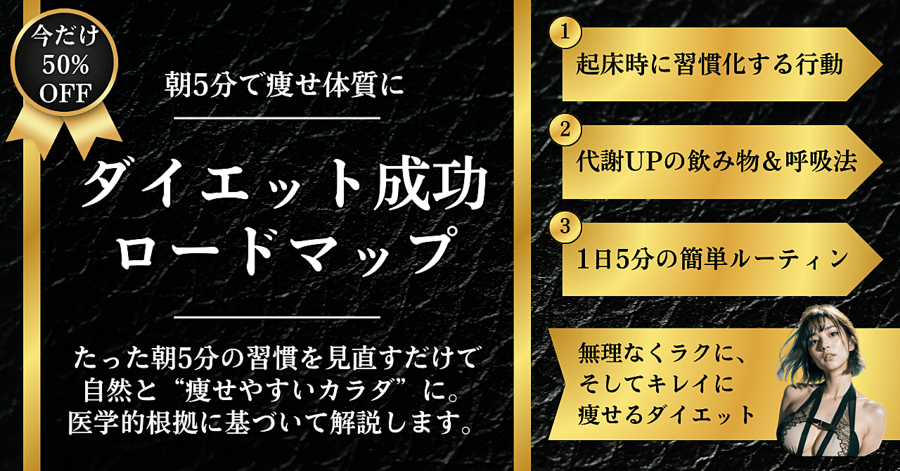 ・朝5分の習慣改善:起床後に行う“ある行動”が代謝を高め、痩せ体質へと導く。 ・代謝UPの飲み物&呼吸法:医学的に効果があるとされる方法を紹介。 ・1日5分のルーティン:初心者でも続けられる簡単なステップで構成。 ・リバウンドしにくい理由:無理な制限をせず、体質そのものを改善するアプローチ。 ・他のダイエット法との違い:我慢や根性に頼らず、続けやすさと効果を両立。 ・成功者の実例:−3kg〜−10kgの成果を出した人たちの声と習慣の変化。