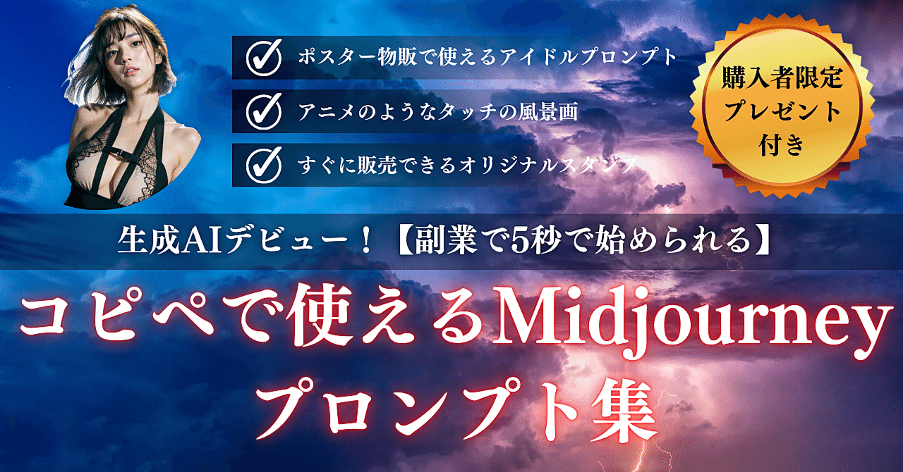 Midjourneyを使って「アイドル系の魅力的なビジュアル」や「副業で活かせる実用的なデザイン」を生成するための具体的なプロンプトが紹介されています。プロンプトの工夫によって、クオリティや雰囲気を自在にコントロールできるのが最大の魅力です。