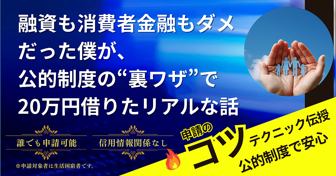 融資も消費者金融も頼れず、八方塞がりだった著者が、意外な「公的制度の裏ワザ」で20万円の資金調達に成功した実体験を語る記事です。