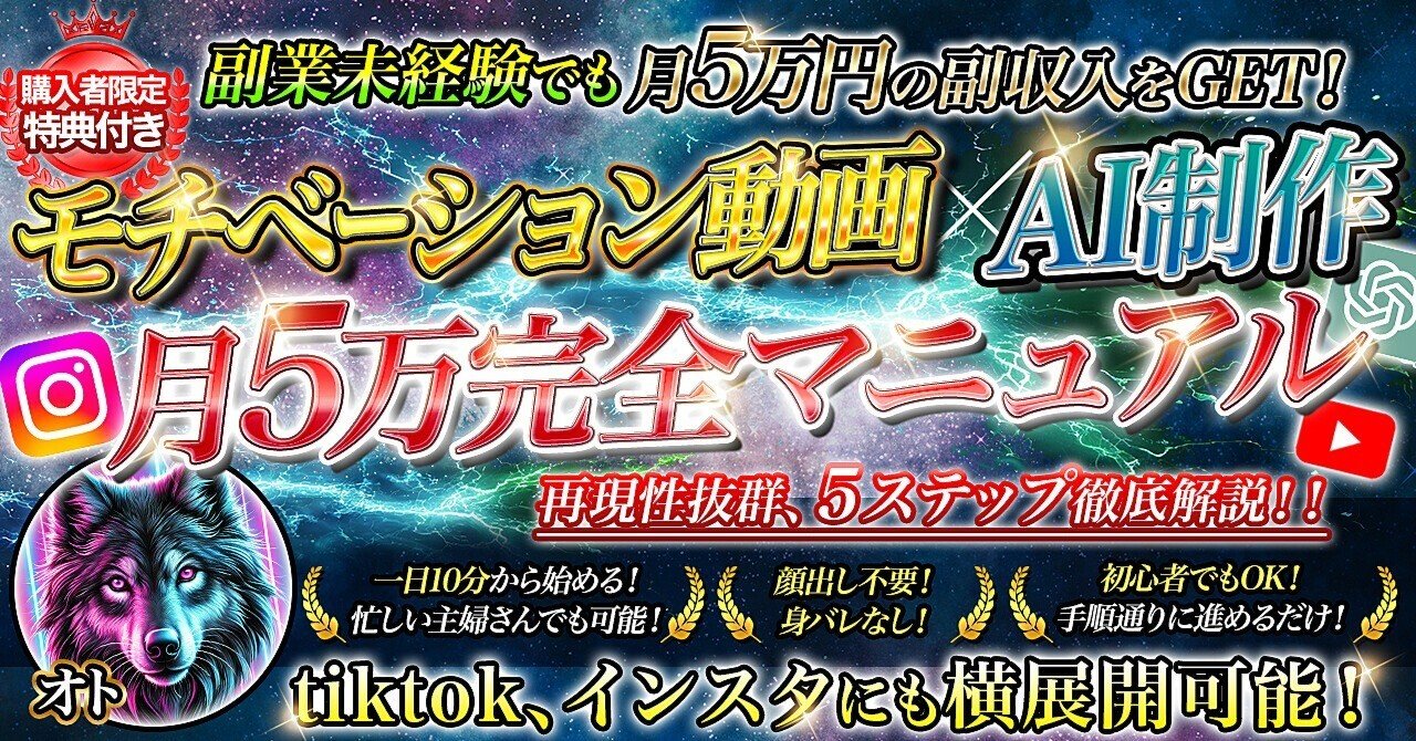 このマニュアルは、AIを活用してモチベーション動画を制作・収益化するまでの流れを初心者にもわかりやすく整理した一冊です。難しい編集スキルが不要で、誰でも短期間で結果を出しやすいのが特徴です。