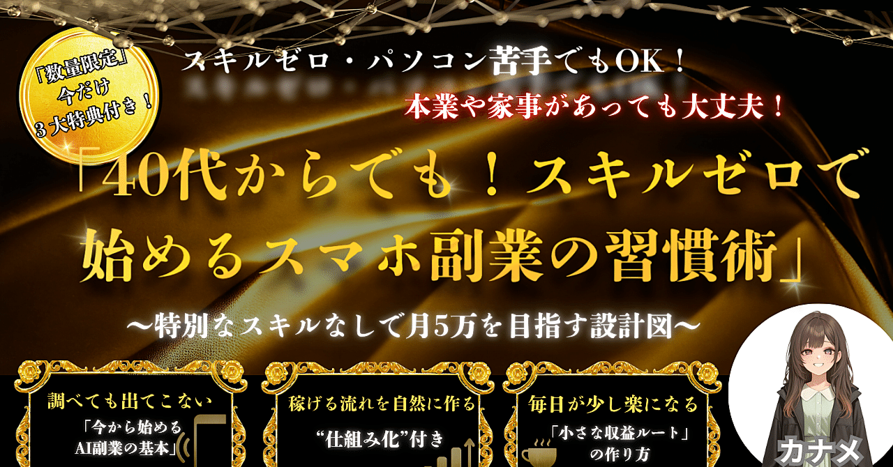 ・スマホ副業の習慣術:スキルゼロでも始められる副業の設計と継続のコツ。 ・40代からの副業戦略:年齢や経験に関係なく取り組める実践的な方法。 ・収益化の導線:月5万円を目指すための行動設計とマインドセット。 ・特典内容:副業を加速させる3つの特典が付属し、実践を後押し。 ・継続の仕組み:習慣化を支える工夫と、途中で挫折しないための設計。