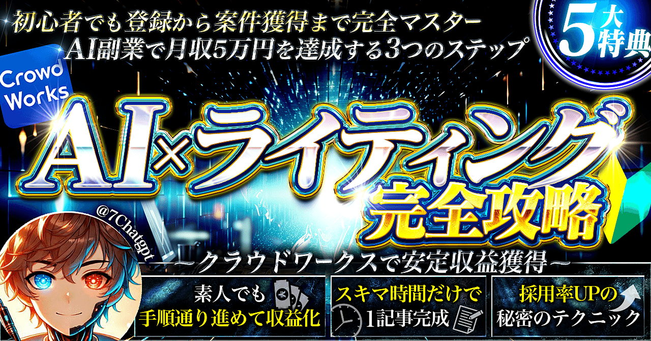AIを活用したライティング手法を徹底的に解説し、クラウドワークスで安定した収益を得るための実践的な戦略を紹介しています。