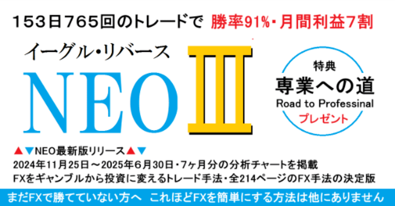 最新のFX手法「イーグル・リバースNEOⅢ」を解説しています。裁量に依存せず、システム化されたルールで安定して利益を狙うことを目的とした内容です。